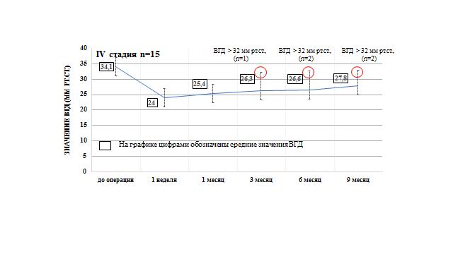 11. Рис. 6. Динамика изменения ВГД при IV стадии глаукомы | |