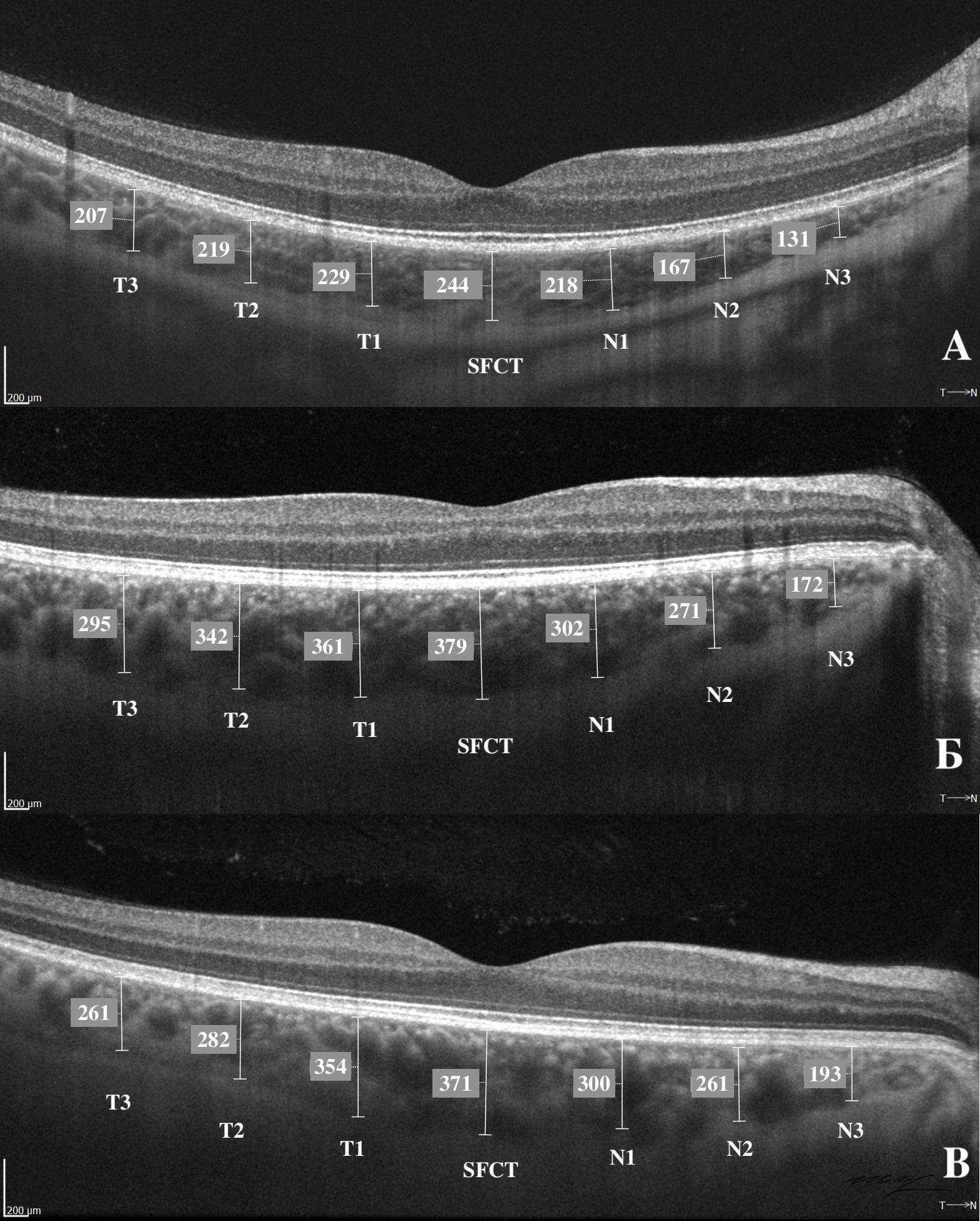1. Рис. 1. Визуализация толщины хориоидеи в макуле на горизонтальном скане SS-OCT Revo NX130, «Optopol»