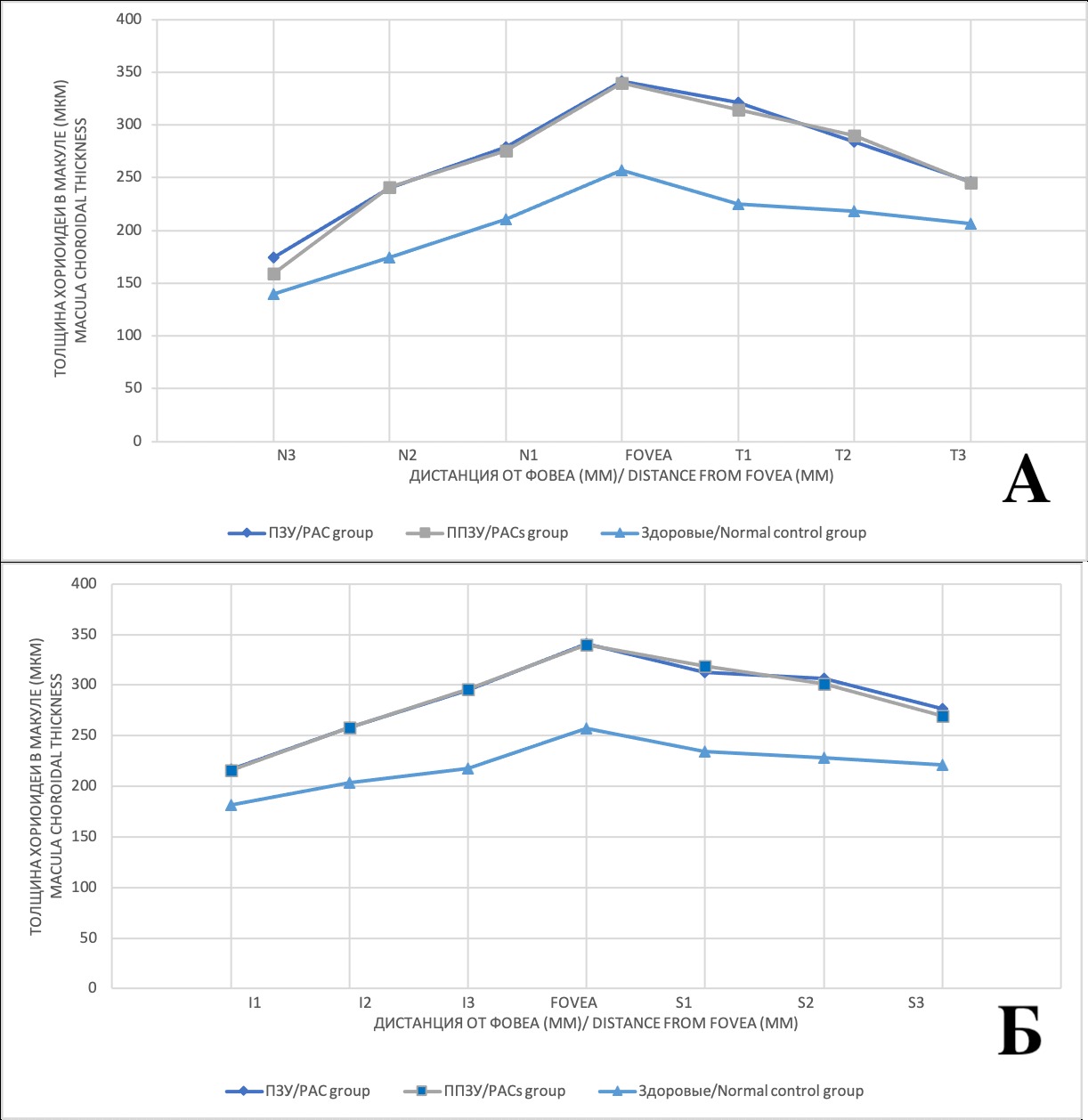 ЗАКЛЮЧЕНИЕ. Увеличение толщины хориоидеи в макуле по сравнению с контролем как при ППЗУ, так и при ПЗУ, а также корреляции субфовеолярной хориоидеи с высотой свода хрусталика и параметрами радужки предполагают участие хориоидеи в патогенезе заболевания первичного закрытия угла (ЗПЗУ). Корреляции высоты свода хрусталика с ВГД, параметрами передней камеры и радужки свидетельствуют о доминирующей роли хрусталика в формировании ЗПЗУ и необходимости ранней его замены.