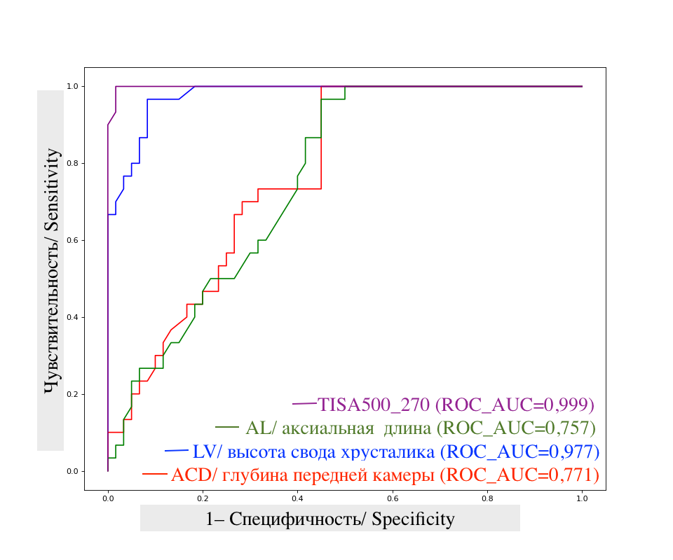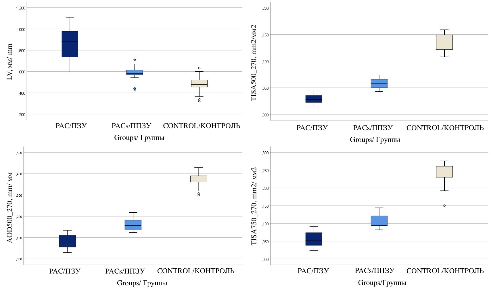 МАТЕРИАЛ И МЕТОДЫ. Проспективное исследование включало 120 пациентов от 41 до 80 лет (60 глаз – ПЗУ, 30 – ППЗУ, 30 глаз – без офтальмопатологии). Исследуемые параметры включали: сфероэквивалент (СЭ), внутриглазное давление (ВГД), толщину хориоидеи в фовеоле (ТХф), аксиальную длину (AL), глубину передней камеры (ACD), высоту свода хрусталика (LV), кривизну радужки и ее толщину, профиль угла передней камеры (УПК): AOD500, AOD750, TISA500, TISA750.